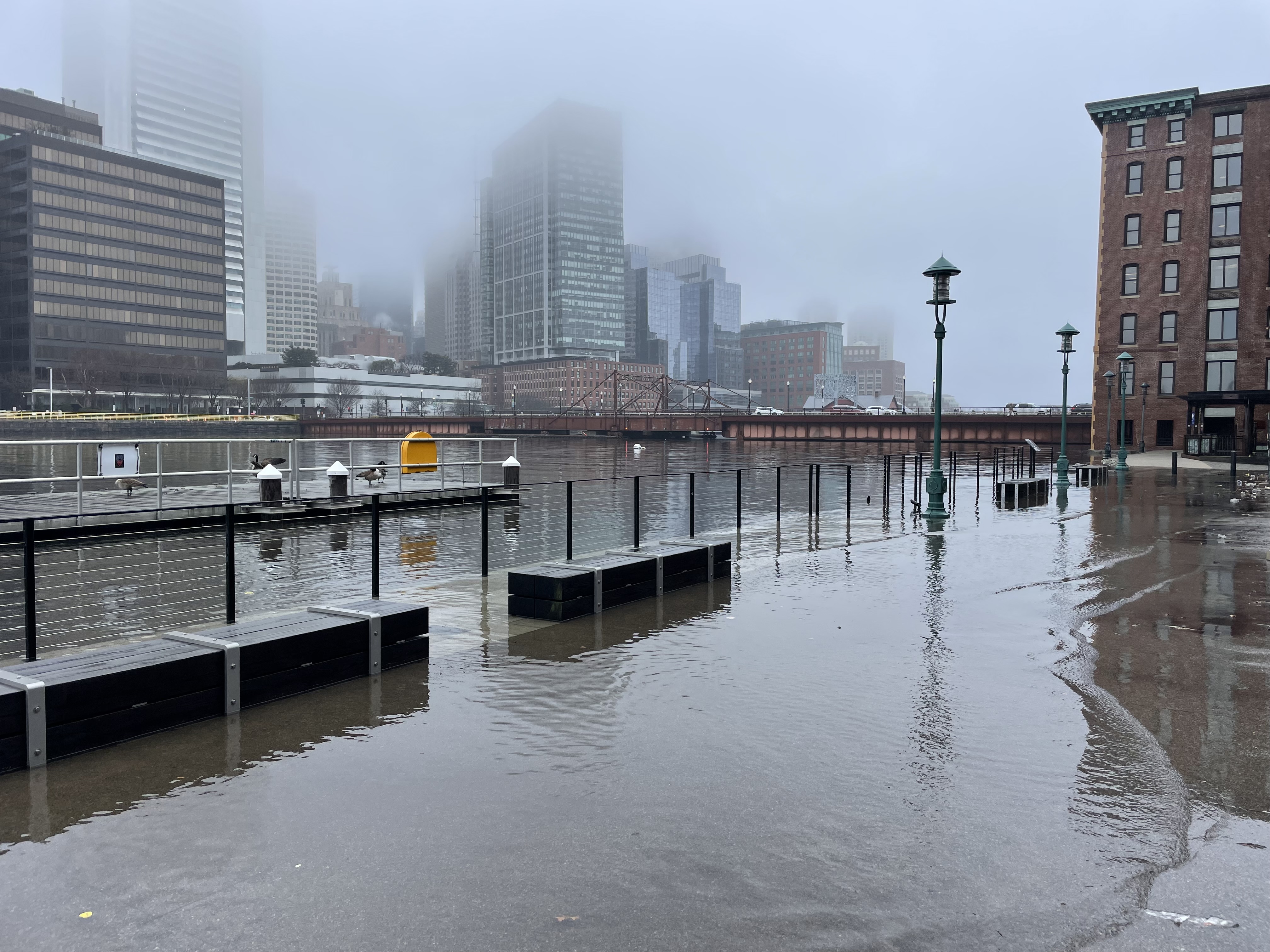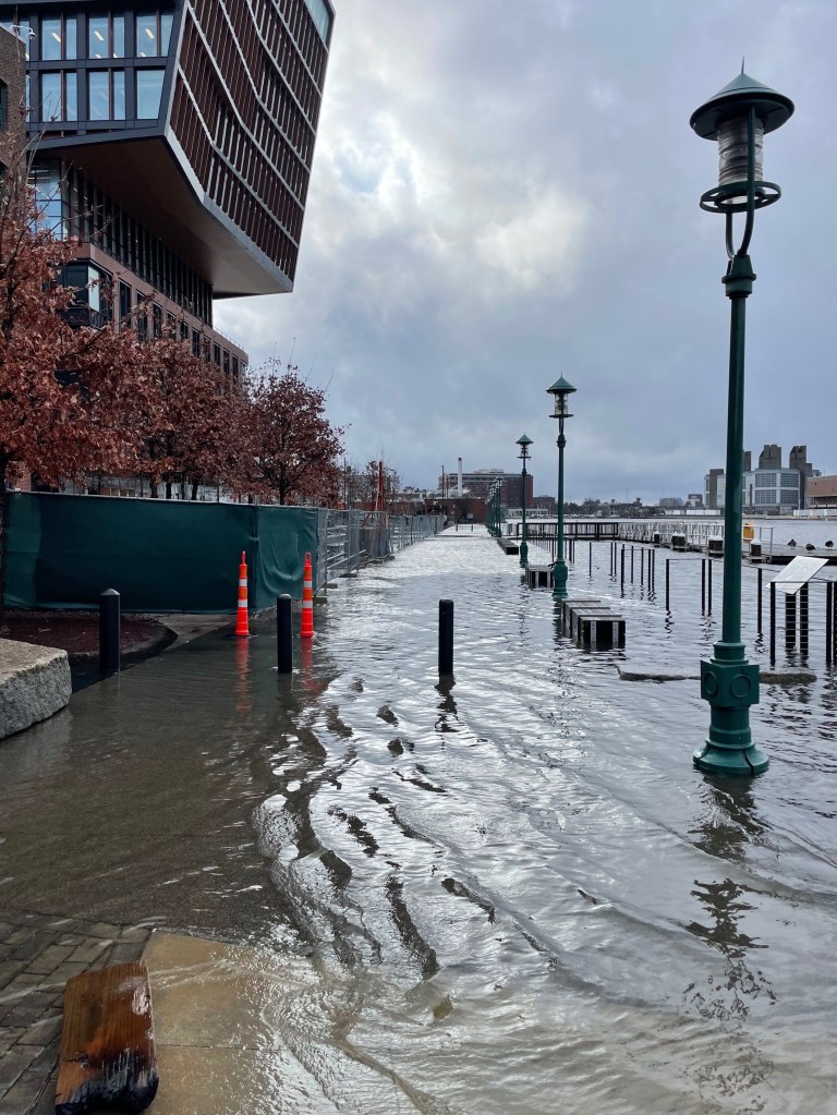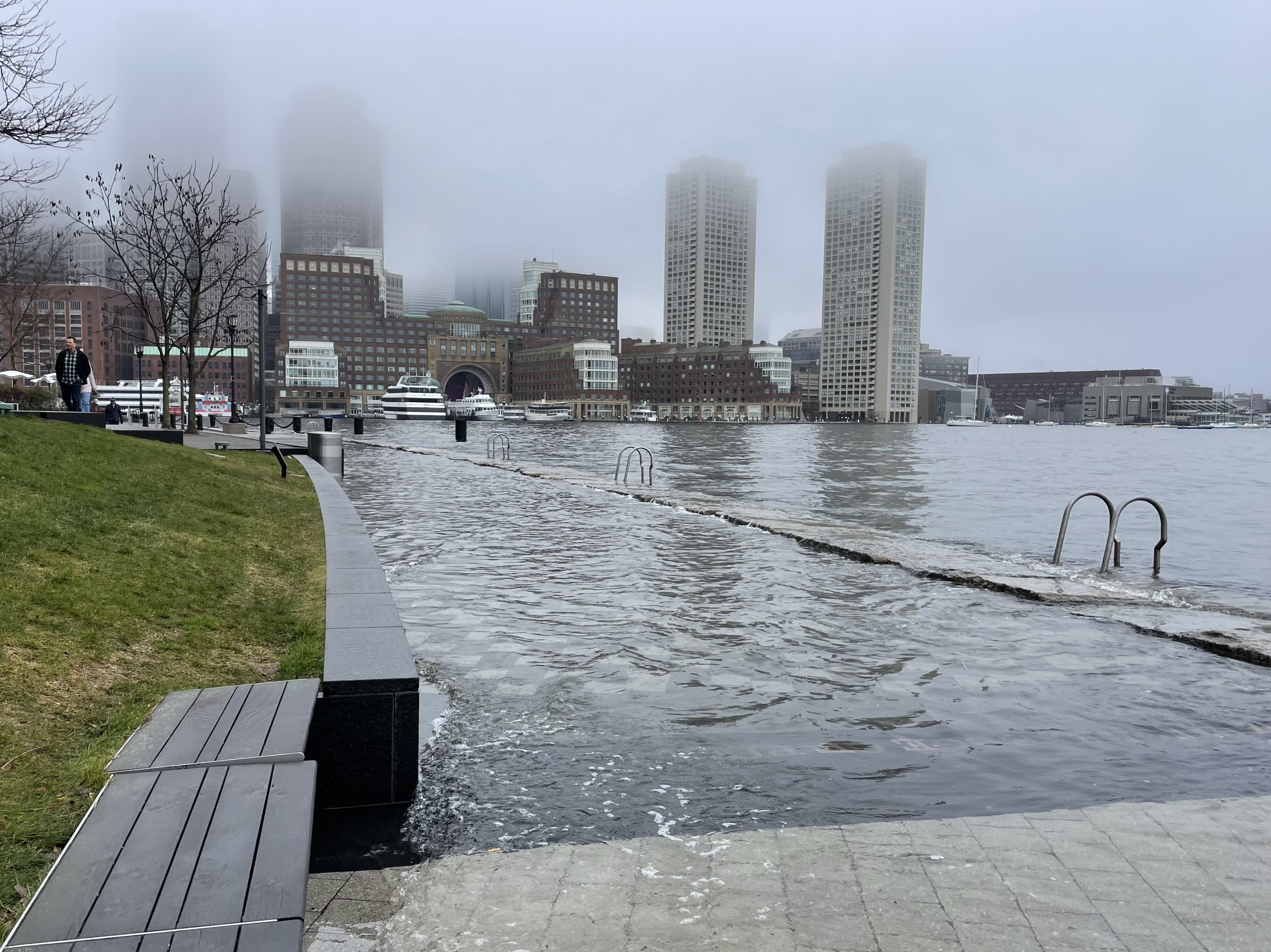 It’s become something of a cliche to suggest the Seaport will be underwater in 10, 20, 50 years—the floating dumpster of 2018 remains the most famous portent of the deluged future—but this breezy, imprecise way of talking about sea-level rise and vulnerable coastal areas doesn’t offer much beyond signaling a kind of au courant, cynical savvy. That is, what are we really talking about? Occasional major flooding events like today or the one in 2018, which combined an astronomical high tide with a storm surge and wave action from a historic ‘bomb cyclone’?