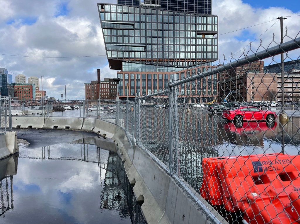 Either way, the building continues, and the ongoing major redevelopment of the land along the Fort Point Channel stands out as one particularly high-profile example. At the very least, it can’t be said the warnings are going entirely unheeded: Related Beal’s plans for Channelside mention ‘Fully extended and integrated flood protection resiliency without visible berm obstruction,’ and ‘Raised site (up to +21.5 BCB) to accommodate Sea Level Rise (SLR) which raises the elevation of most site catch basin grates above 2070 high tide line.’
