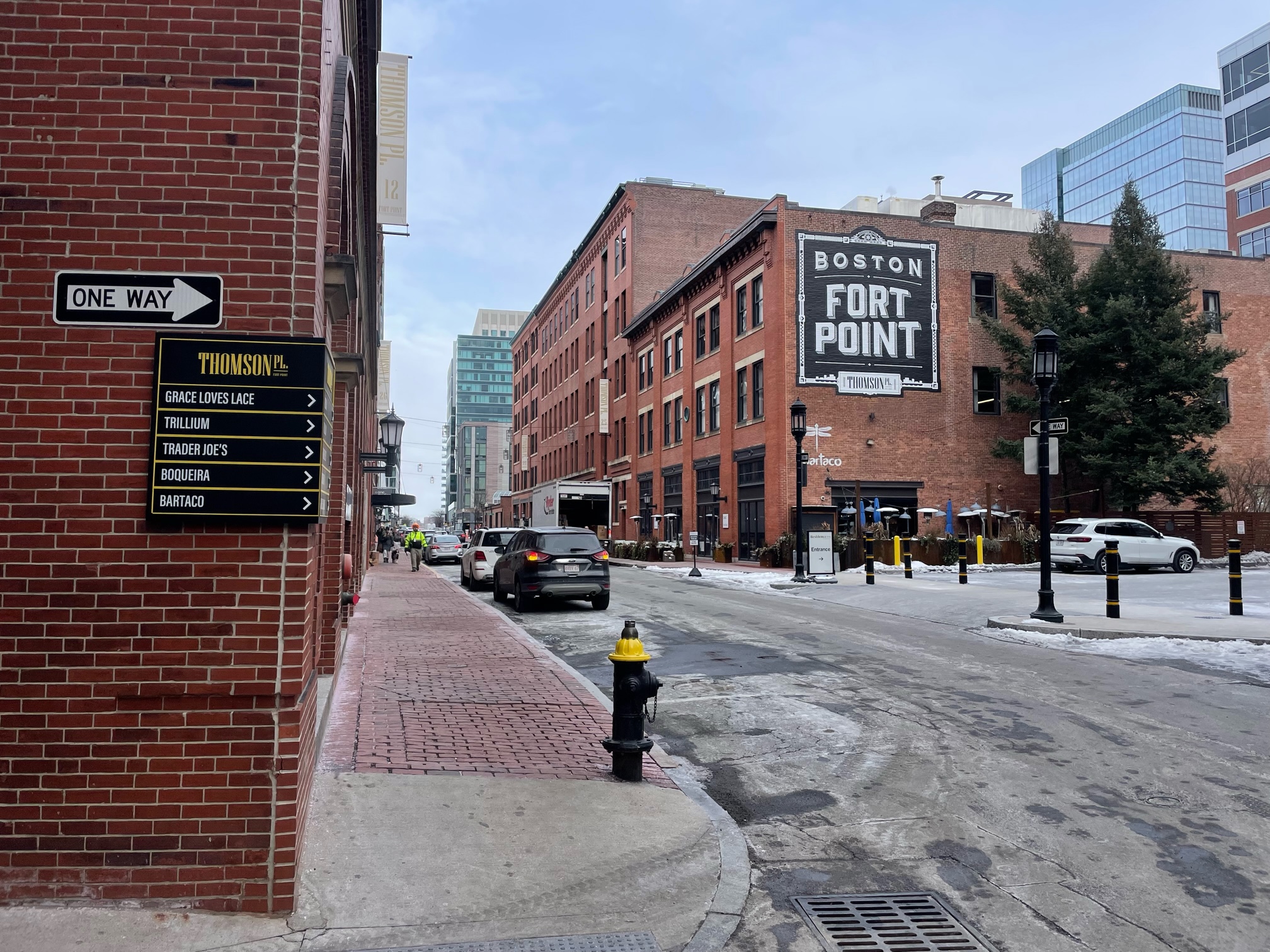Thomson Place in the Fort Point neighborhood of Boston is a street by any definition, and indeed has become something of the main drag of the surrounding area, home to the Trillium brewery, Trader Joe’s grocery store, four restaurants and counting, a medical clinic, and several corporate offices. There is a Marriott hotel at one end, and a Shake Shack and Silver Line transit station at the other. Its calm, one-way traffic is a refreshing respite from the rushing clamor of both Seaport Boulevard and Congress Street, and its historic, human-scaled architecture stands in stark contrast to the hulking new towers of the master-planned Seaport Square project nearby. But Thomson Place is technically not a public space. It is a ‘private way,’ not owned by the city of Boston, but by Invesco Real Estate and Newton-based Crosspoint Associates.