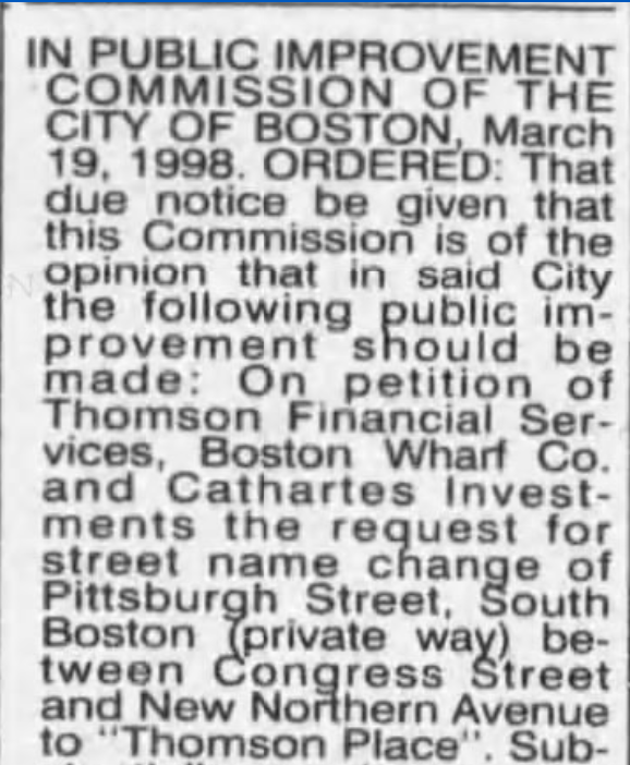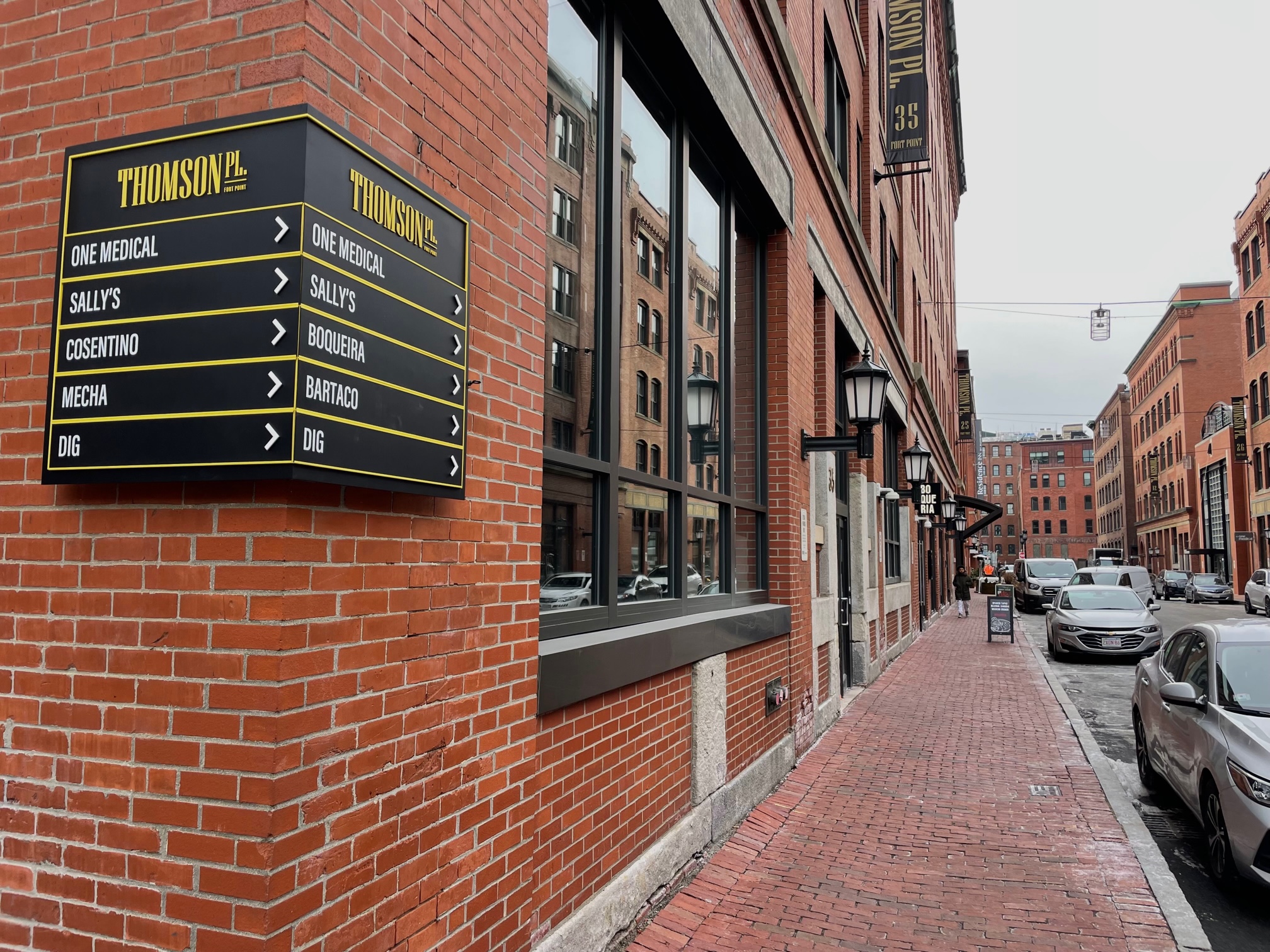 26 Thomson Place now houses the Amazon-owned One Medical primary care clinic. The renaming from Pittsburgh Street dates to 1998, at the request of the Boston Wharf Co. and its flagship tenant Thomson Financial Group, which began occupying Fort Point office space as early as 1982, launching a trend of major corporate moves to the South Boston Waterfront decades before the likes of Vertex Pharmaceuticals followed suit.