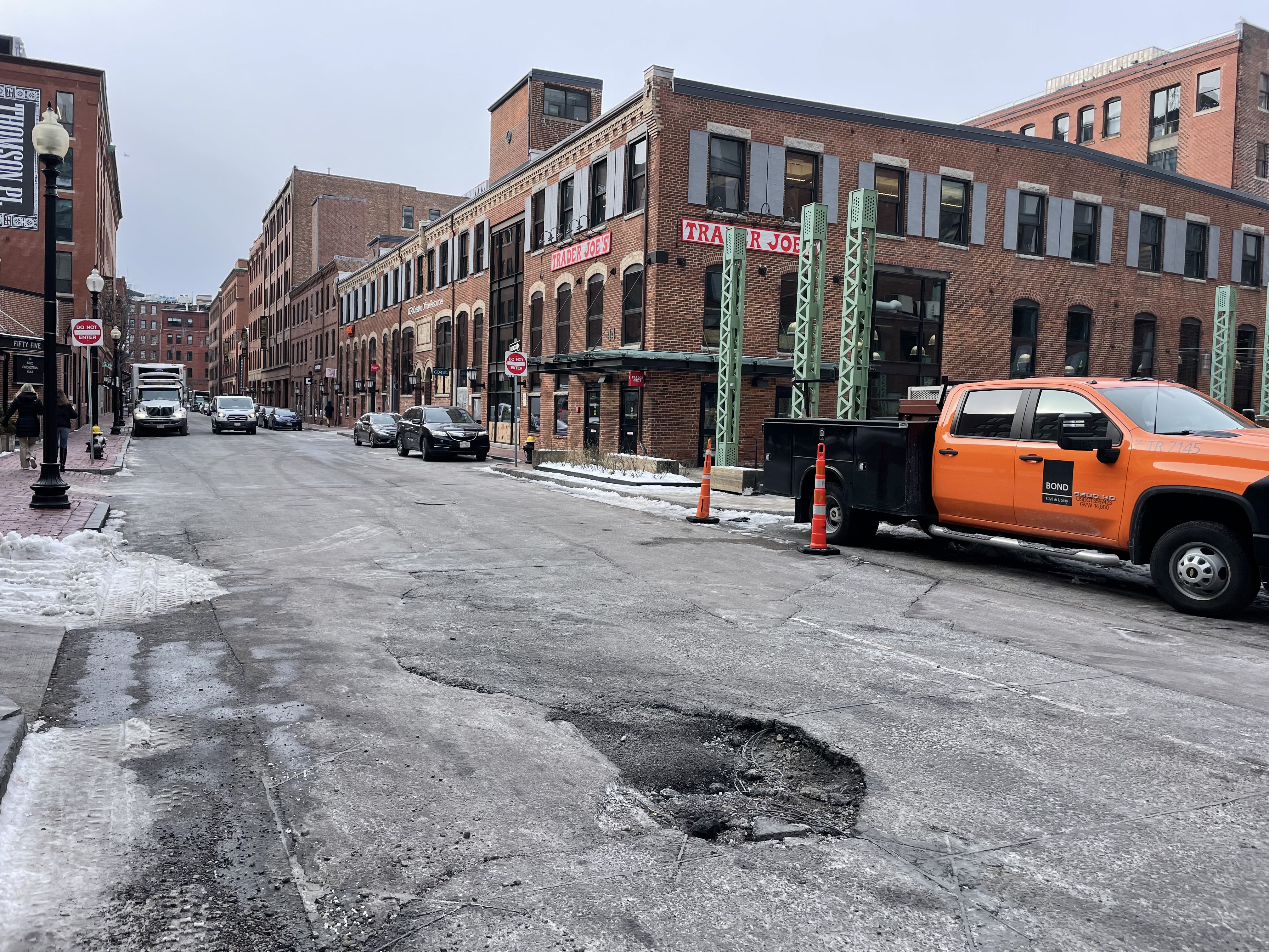 So what does any of this have to do with a pothole? Again, despite its redevelopment over the last five years as a central dining and shopping destination, Thomson Place has retained its designation as a ‘private way.’ This has important implications for street upkeep: while the ‘City of Boston is responsible for all general maintenance of public ways,’ ‘residents are responsible for all maintenance of the streets and sidewalks along the private way.’ Which is how you end up with a situation like this:
