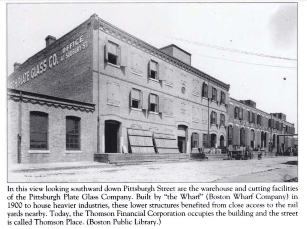 Study Report. The story goes something like this: the Boston Wharf Company, which built more or less the entire Fort Point district from scratch starting in the mid-nineteenth century, laid out the A Street Extension in 1896, which was later named Pittsburgh Street for the Pittsburgh Plate Glass Company that occupied a cluster of buildings at the northern end of the street, including the striking, low-slung warehouse that now hosts Trader Joe’s.