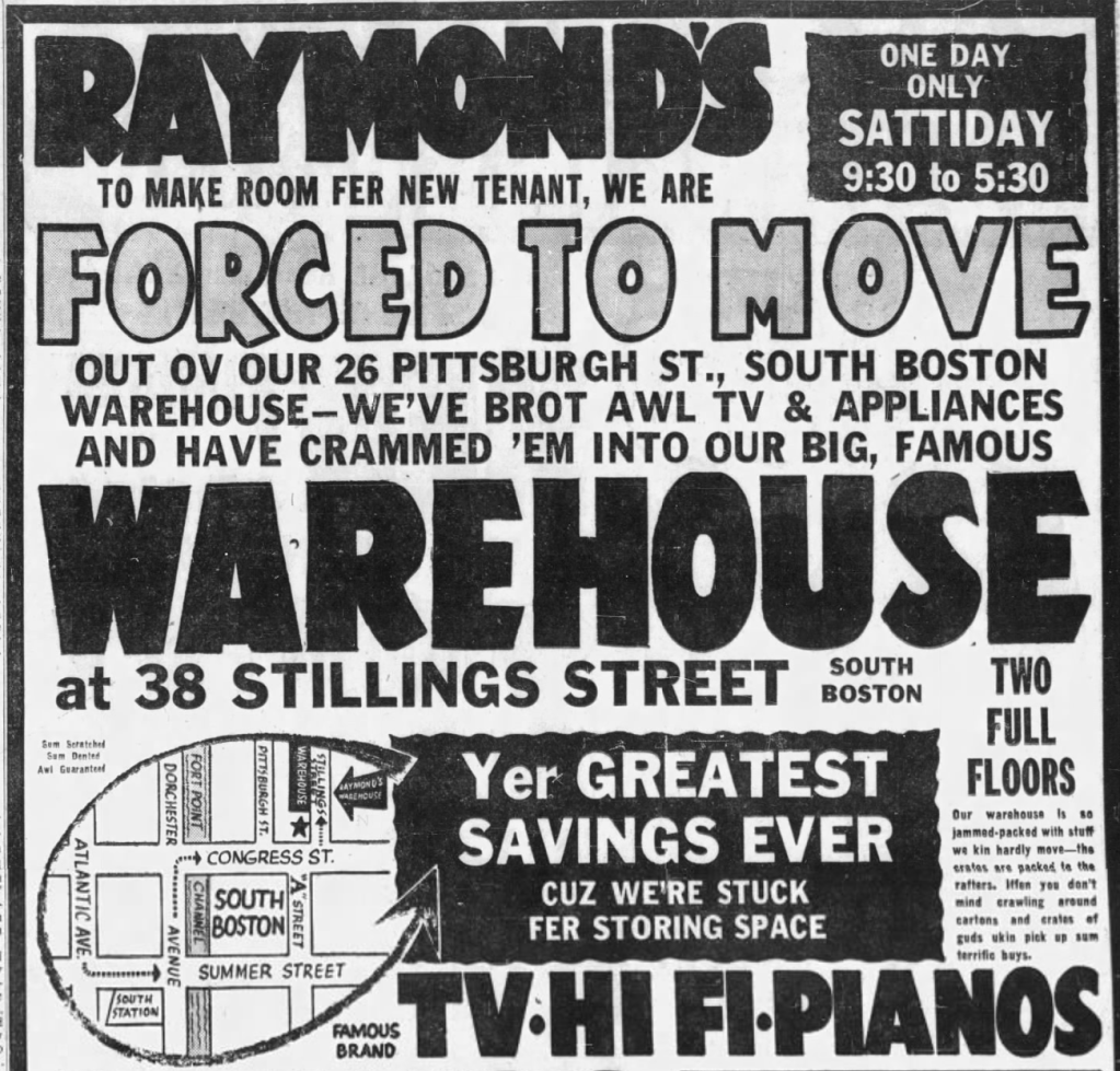 From there it gets hazier, requiring a deep dive into the Globe archives for clues as to what was going on during the ‘dark’ decades between Fort Point’s industrial heyday and its ongoing revitalization from roughly the 1980s onward. In 1954 there’s a record of the Central Wool Warehouse Corporation occupying the building at 26 Pittsburgh Street, which then served briefly as some kind of home appliance clearing house for the once-prominent department store Raymond’s, a more downmarket competitor to Filene’s and Jordan Marsh. Its advertising copy employed an eccentric, ‘swamp Yankee’ vernacular full of creative misspellings: