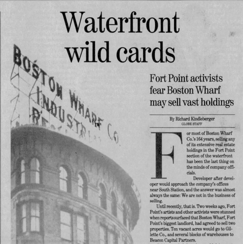 The same year, the Boston Wharf Company began selling off its sprawling holdings in Fort Point, the most consequential move since its creation of the area 150 years prior, and one that left the pioneering local artist community ‘stunned.’ The writing was on the wall; the Globe quoted a local resident and activist who feared a coming wave of development would leave Fort Point with ‘tourists on one end and a duplication of the Financial District on the other, and very little left over for a real neighborhood.’