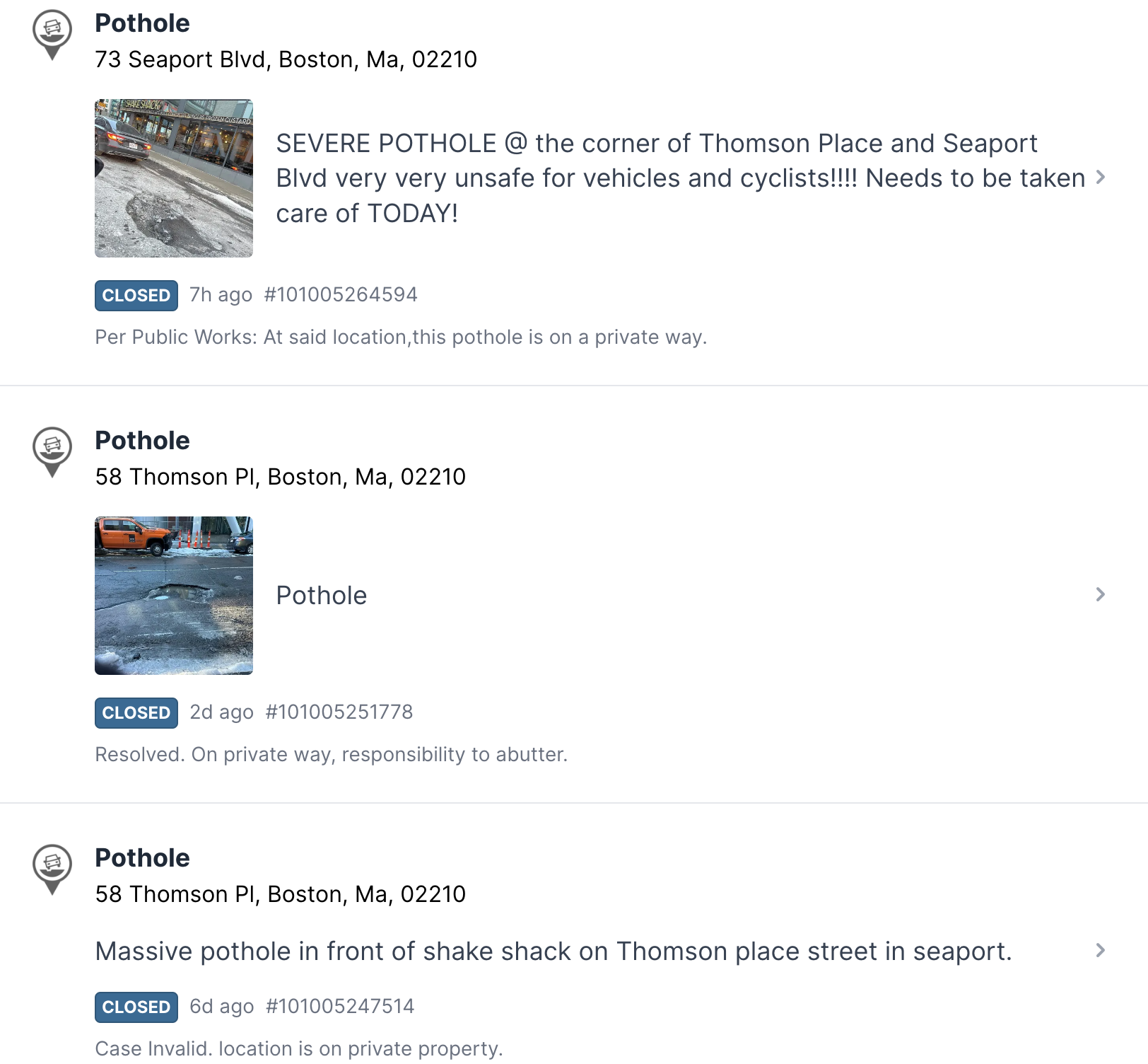 Since New Year’s Eve there have been five separate 311 reports of this specific pothole at the north end of Thomson Place between Trillium and Shake Shack, and the earliest claims that ‘It’s been there for over a year!!’ (The following sadly reports that the pothole ‘dented my rim and cost $600 to fix.’) All but the first have been closed without resolution with variations of the same response: ‘Per Public Works: On private way, responsibility to abutter.’ In other words, not the city’s problem. There’s a touch of bureaucratic absurdity to the finger-pointing that’s a little funny and a little bleak, simultaneously banal yet also symbolic of a deeper dysfunction that plagues our public places and infrastructure. That is, in the most expensive neighborhood in one of the richest cities in the richest country in the world, if we can’t fix a pothole in a well-trafficked thoroughfare, how can we possibly call ourselves serious people?